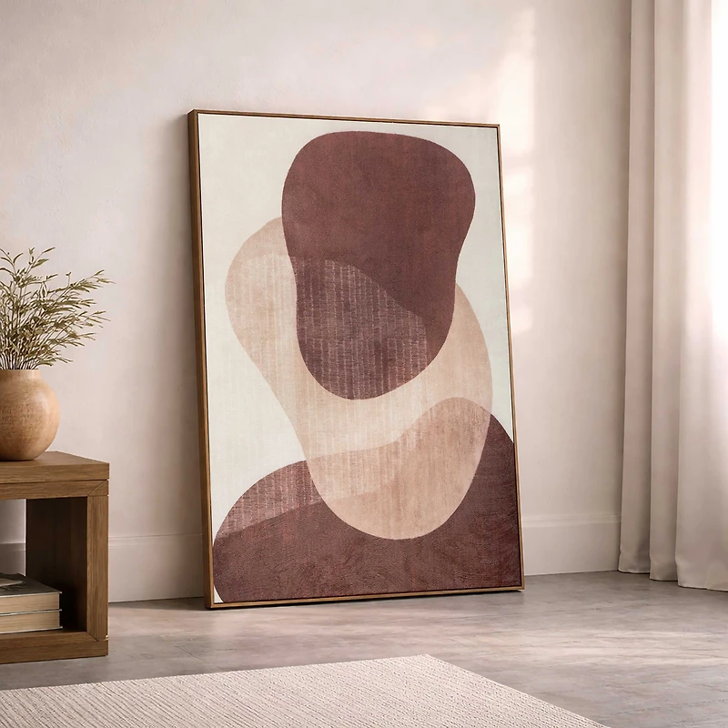 This piece is a contemporary abstract artwork defined by softly layered shapes and warm, earth-inspired tones. Measuring 36" x 52", the piece features hand-applied texture that adds depth and visual interest, while its neutral palette allows it to i
