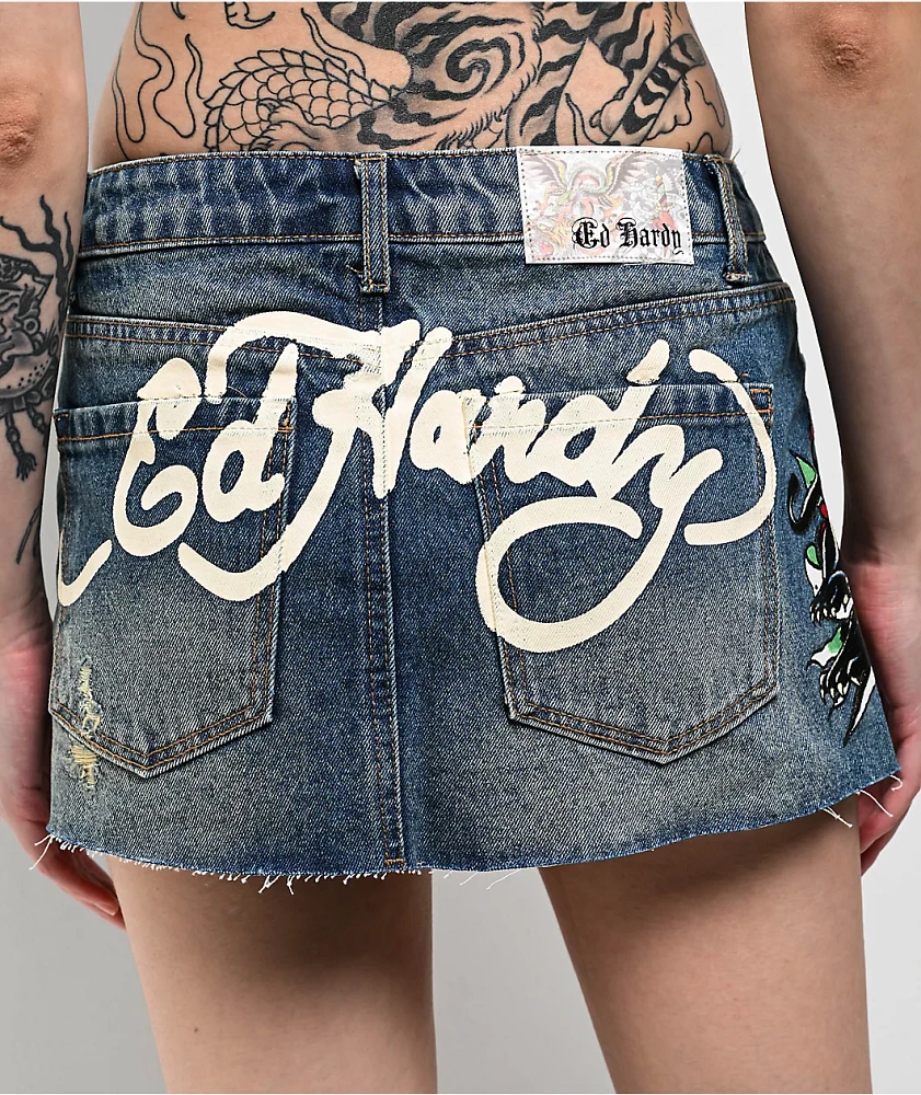 Enjoy a classic vibe with the Panther Dagger cutoff denim mini skirt from Ed Hardy, landing in a dark blue wash. Screen-printed art on the right features vintage tattoo art of a black Panther crouching over a Dagger, with Ed Hardy branding across the