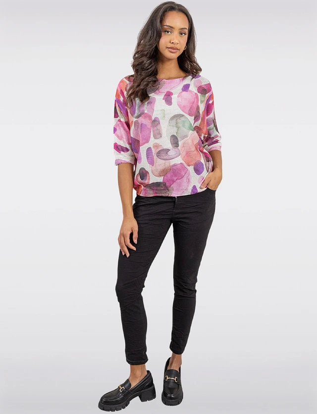 Elegant 3/4 Sleeve Boatneck Knit Top with a Trendy Printed Design by Froccella