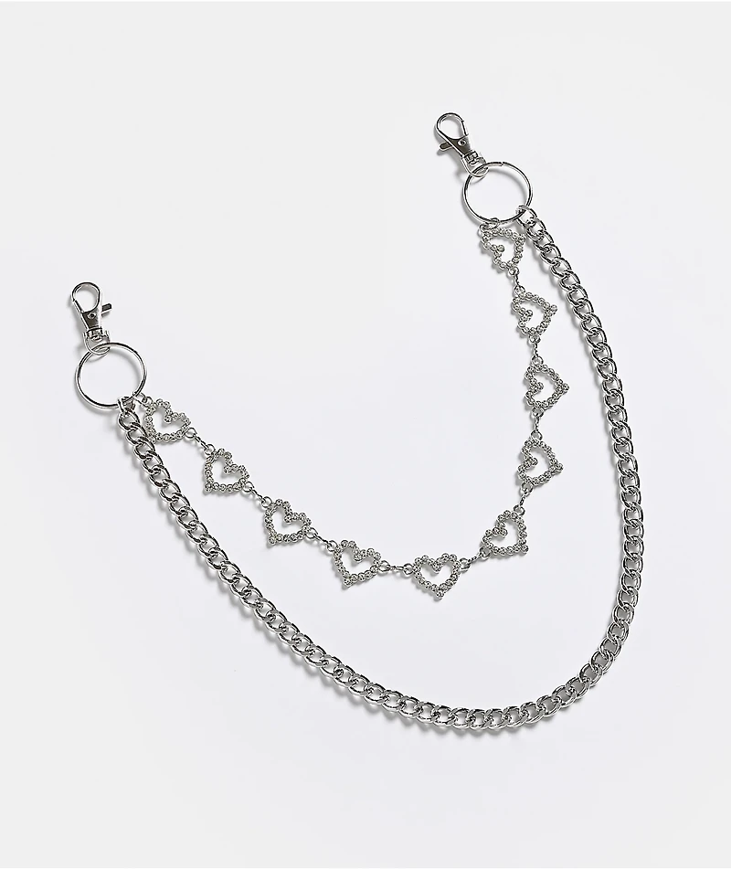 The Pave Heart silver pocket chain from Ella Shea blends edgy hardware with delicate sparkle through its rhinestone heart detailing. A second solid chain balances the shine of the dual-look for a wearable, everyday statement. Measuring eighteen inche