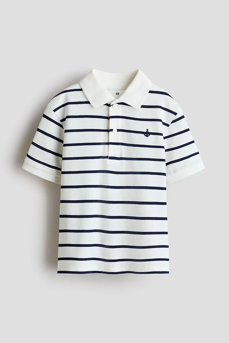 Polo shirt in cotton piqué with an embroidered motif at front. Collar, short button placket, gently dropped shoulders, and short sleeves.
