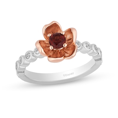 Enchanted Disney Snow White Garnet and 0.085 CT. T.W. Diamond Flower Ring in Sterling Silver and 10K Rose Gold - Size 7
