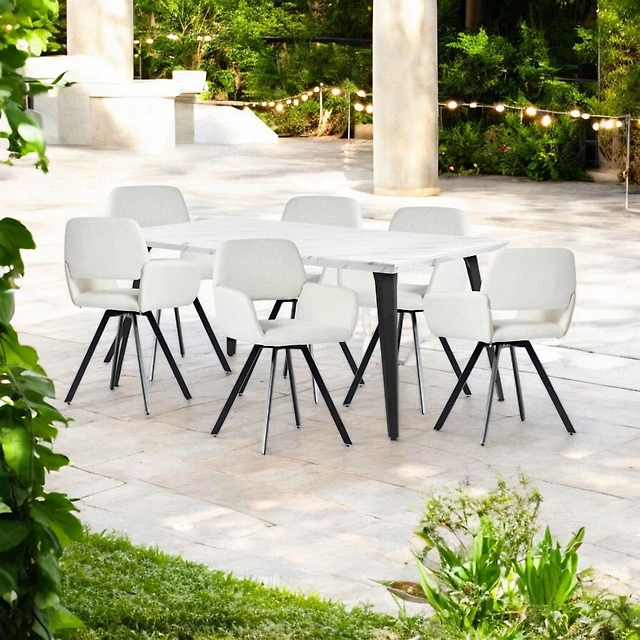Ensemble de salle à manger en finition marbre avec chaises pivotantes beiges, 7 pièces