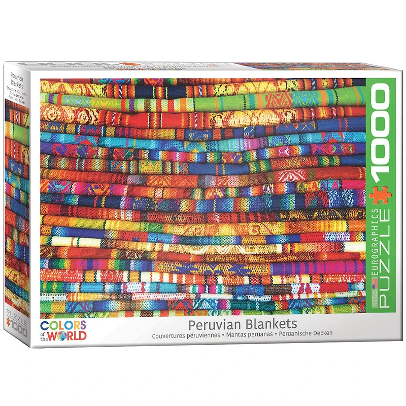 EuroGraphics Peruvian Blankets 1000-Piece Puzzle Everywhere you go in Peru, you'll see textiles on sale. The markets are adorned with the vibrant warm hues of traditional blankets woven with care from the finest alpaca wool.