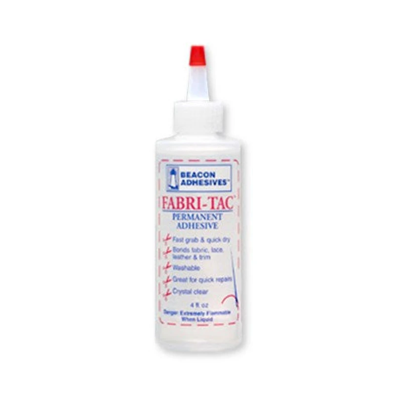 This permanent, fast grab, quick drying, crystal clear, and washable glue is fantastic for fabric, wood, leather, lace, suede, tile, felt, pearls & gems (except for those with a silver coating on back) plaster, glass, trims, canvas, ribbons, hats, & much more. Fabri-tac won't stain or soak into fabrics, and is perfect for hems, seams and other clothing repairs. Fabri-tac prevents fraying and maintains its strength through countless washing. Fabri-tac is ideal for creating dolls, pillows, stuffed animals, wreaths, dried floral arrangements, picture frames, ornaments, gift and jewelry boxes, lampshades, upholstery, drapes, handbags, shoes, bridal headpieces, party favors, and many other projects. Easier to use than a glue gun... no heat, mess or inconvenience.                               HELPFUL HINTS•Poke a hole in applicator tip with a large paper clip to release a more precise line of glue. To cover larger surfaces, snip tip near top.•Always keep top covered to prevent evaporation. •Thin with acetone. Add acetone drop by drop, stirring, until desired consistency is achieved.•Never use fine furniture as a work surface even if protected as the acetone fumes will attack the finish.•Make sure all work surfaces are properly covered when using.•Pre-wash all fabrics to remove sizing before applying glue. Sizing prevents glue from thoroughly penetrating fibers. Some metallic threaded fabrics might require two washings.•Not suitable for applying patches to fabrics as patches have a coating on back that prevents glue from absorbing into the fibers.•Dry clean to remove glue from garments. •Glue is designed to bond to the top fibers of the fabric and should not be "pushed" into the garment as stiffening will result.•Flammable only when wet and should never be applied near an open flame. Once dried, there is no danger of flammability.•Always use with proper ventilation.•Not suitable for use on Velcro, denier nylon, or very sheer and delicate fabrics where glue might soak through.•Glue dries very fast. Work in small 1-3 » areas to prevent glue from drying too rapidly.•If glue separates after washing, garment was not properly pre-washed to remove sizing, glue was allowed to dry before adhering, and surface did not allow glue to penetrate fibers.