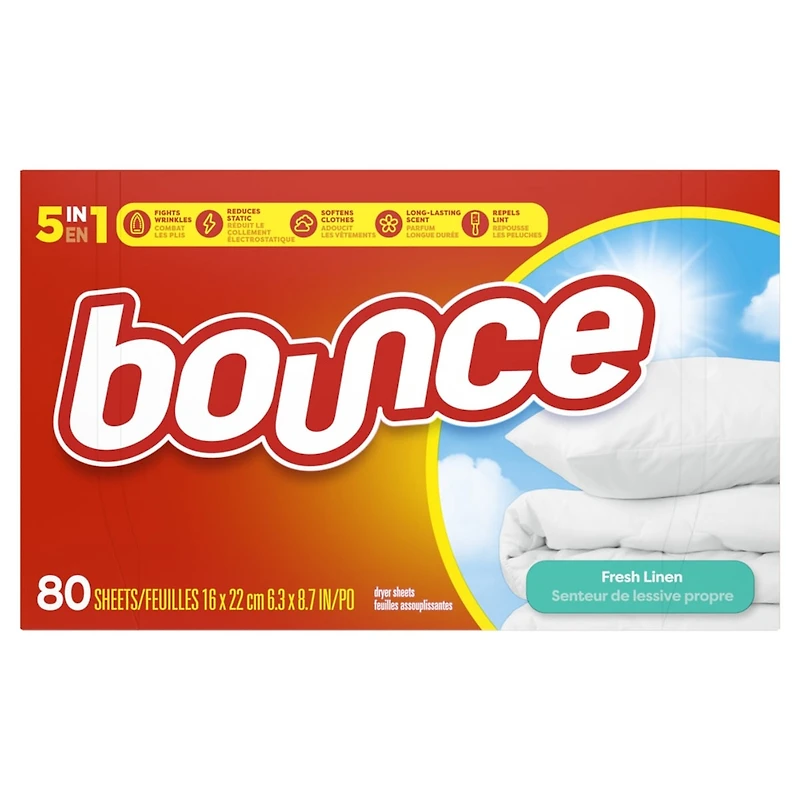 Our Bounce Fabric Softener Dryer Sheets with that Fresh Linen scent really do have a lot in common with linen (the fabric) – both are cool, crisp and light. But Bounce might just have something that real linen could use – the power to fight static, reduce wrinkles, repel lint and hair while keeping your fabrics soft. Take that linen.