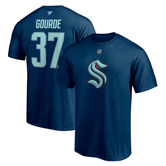 Fanatics pour hommes Yanni Gourde Deep Sea Blue Seattle Kraken - T-shirt authentique avec nom et numéro de pile