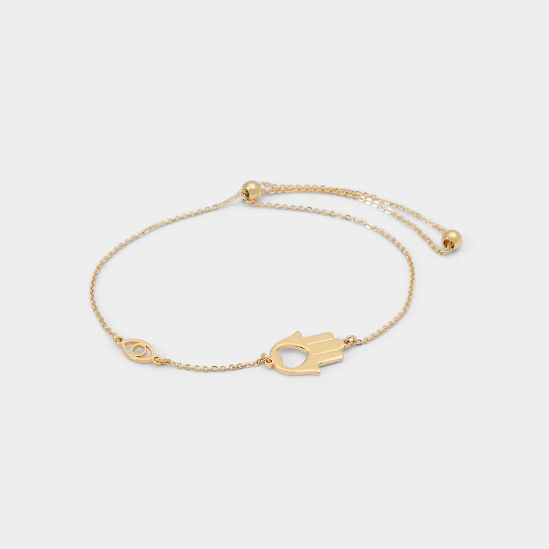 Hamsa-hand charm sits atop a heart-detailed gold-plated bracelet, its eye catching light as a slim linked chain glides with every movement. Layer crystal drops for cocktails or keep just the bracelet in a subtle stack under a sleek dress for evenings, finishing looks with a shimmering edge.