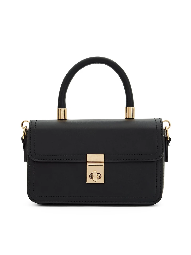 Clean lines and classic structure define this faux-leather satchel bag, designed for effortless, everyday polish. Crafted in smooth faux leather, this structured silhouette features a top handle and a removable shoulder strap for versatile styling. Finished with sleek hardware and a secure front closure, it offers a timeless look that pairs seamlessly with workwear, dresses, and off-duty outfits alike. A modern essential that balances function with understated style.