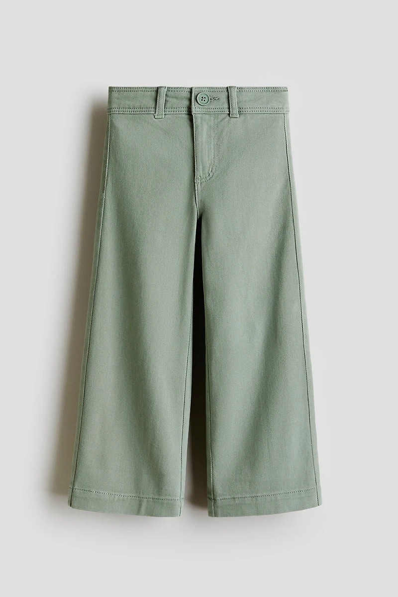 Pants in stretch cotton twill. Adjustable, elasticized waistband, zip fly with button, and open back pockets. Wide, flared legs.