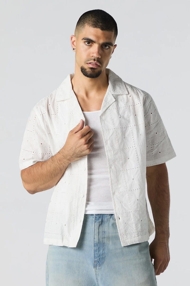 This top features textured material, embroidery, short sleeves, button-up front, and collared neckline.