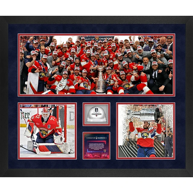 Florida Panthers 2024 Champions de la Coupe Stanley Encadré 20'' x 24'' Collage de 3 photographies avec glace utilisée par le jeu - Édition limitée de 2024