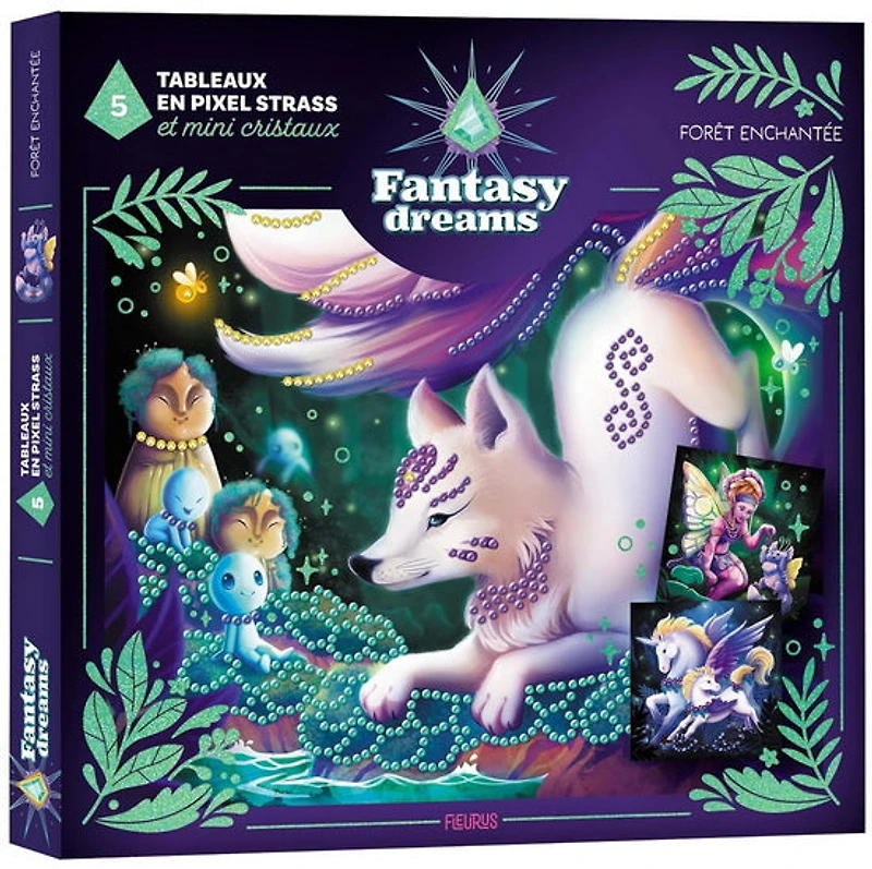 Un monde mystérieux et féerique à découvrir grâce à ces 5 magnifiques tableaux FANTASY DREAMS ! Ce kit contient un set d'application facile (coupelle, carré de cire et stylet), plus de 3000 pixel strass de 3 couleurs (bleu, violet, turquoise) et 600 mini cristaux (jaune) pour décorer les tableaux et leur apporter du relief.