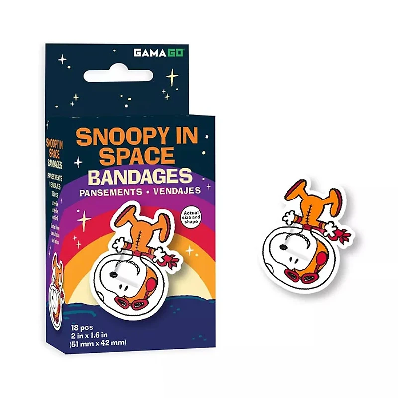 Gamago Snoopy In Space Bandages 18 Pieces | Designed to cover and protect minor cuts and scrapes, each bandage is individually wrapped and comes with a nonstick pad that does not stick to the wound and is easily removed.