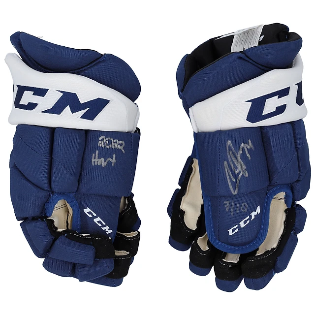 Gants de jeu CCM bleus autographiés Auston Matthews des Maple Leafs de Toronto avec inscription « 2022 Hart » - Édition limitée à 10