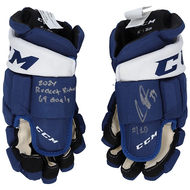 Gants de jeu CCM bleus autographiés Auston Matthews Toronto Maple Leafs avec inscriptions multiples - Édition limitée à 10