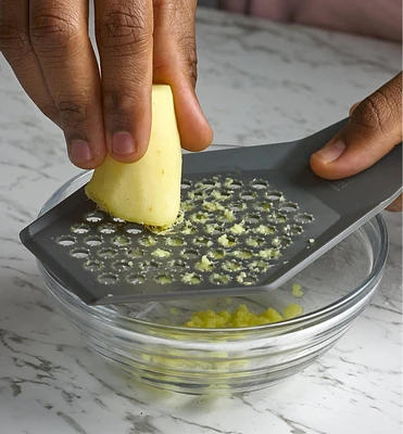 You don’t have to get your hands messy when using this tool – it lets you press garlic, scrape it into a pan and discard the peel without touching pulp or juice. It can handle peeled or unpeeled cloves, with a hopper large enough to fit a few at once: the long handles give you plenty of leverage. Once the garlic is crushed, opening the handles slides a bar across the grate, scraping off any bits left behind. You don’t even have to handle the skins left behind in the hopper – at the push of a button, an arm ejects them for disposal.
