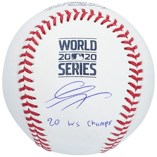 Gavin Lux des Dodgers de Los Angeles a autographié le logo des champions de la Série mondiale de la MLB 2020 avec l'inscription « 2020 WS Champs »