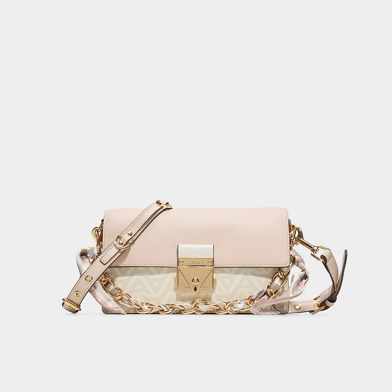 Geometric paneling catches the light on this shoulder bag, turning a front-flap silhouette with a flip-lock into playful sophistication, complemented by a scarf-wrapped chain. Carry by the chain for evenings or switch to the adjustable strap for brunch dates or a night out, finishing every look with easy confidence.