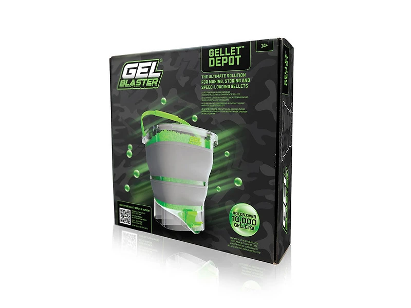 HYDRATE, STRAIN AND SPEED LOAD YOUR GELLETS! Gellet Depot acts as your home base for reloading and jumping back into the battle. Gellets last indefinitely when dehydrated, and up to three months when submerged in water. Gel Blaster Gellets expand 10x their size when fully hydrated. When you're ready to play, use the built in strainer to remove excess water and you're back in the action! COLLAPSIBLE AND CONVENIENT Fully expanded, it measures at 8 inches in height and 10.5 inches in width and shrinks down to 2 inches in height when collapsed for easy storage. This 1 Gallon bucket holds 10,000+ Gellets. Gellets last indefinitely when dehydrated, and up to three months when submerged in water. PRACTICAL AND PORTABLE Features a built-in strainer to drain excess water without losing Gellets in the process. Includes lid and carry handle so you can easily bring your Gellet ammunition with you on the go, or store Gellets for later game play. Holds 10,000+ Gellets Built in Water Strainer Built in Gellet Speed Loader Lid and Carry Handle Collapsible Volume: 1 Gallon Dimensions Collapsed: Width 10.5in, Height 2in Dimensions Flat: Width 10.5in, Height 8in