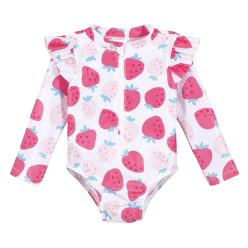 Our baby and toddler swimsuits and rash guards are made with UPF 50+ fabric to prevent your little one from getting sunburnt. They’re cute, comfy, easy-care, and perfect for any swimming adventure! Our rash guards feature a zip front for easy on/off and long sleeves for maximum coverage. This rash guard is machine wash / tumble dry low. This pack includes one pink baby or toddler girl rash guard with strawberry art.