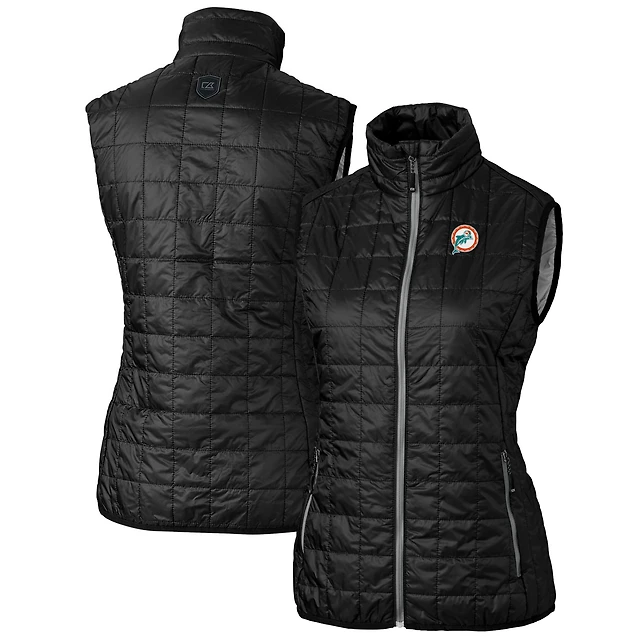 Gilet matelassé entièrement zippé Rainier PrimaLoft Eco pour femme, noir, avec logo rétro des Dolphins de Miami, Cutter & Buck