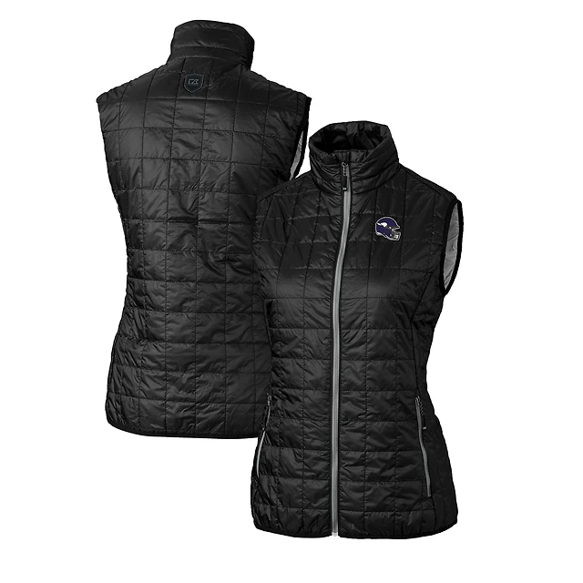 Gilet matelassé isolant entièrement zippé Rainier PrimaLoft Eco pour femme, noir, avec logo du casque des Vikings Minnesota, Cutter & Buck