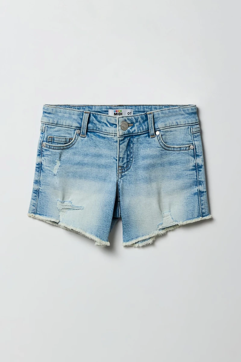 This short features stretch denim material, distressing, low-rise waist, zip-fly button-up closure, 5 pockets, belt loops, and frayed hem.