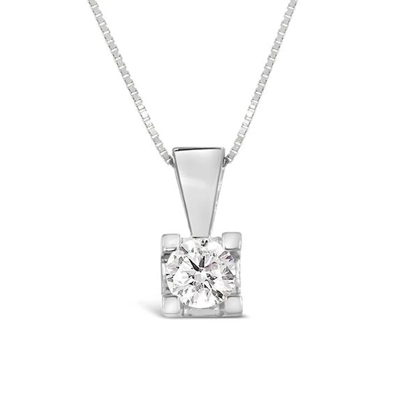 Mined from deep withing Canada's arctic tundra this pendant boasts a 0.33ct round brilliant cut Glacier Fire Canadian diamond. Fashioned in icy 14kt white gold and suspended from an 18" box link chain with a lobster claw clasp, this timeless classic is an eye catching adornment for your love. Every purchase of a Glacier Fire diamond is accompanied with a Certificate of Authenticity which confirms that the diamond was mined in Canada.