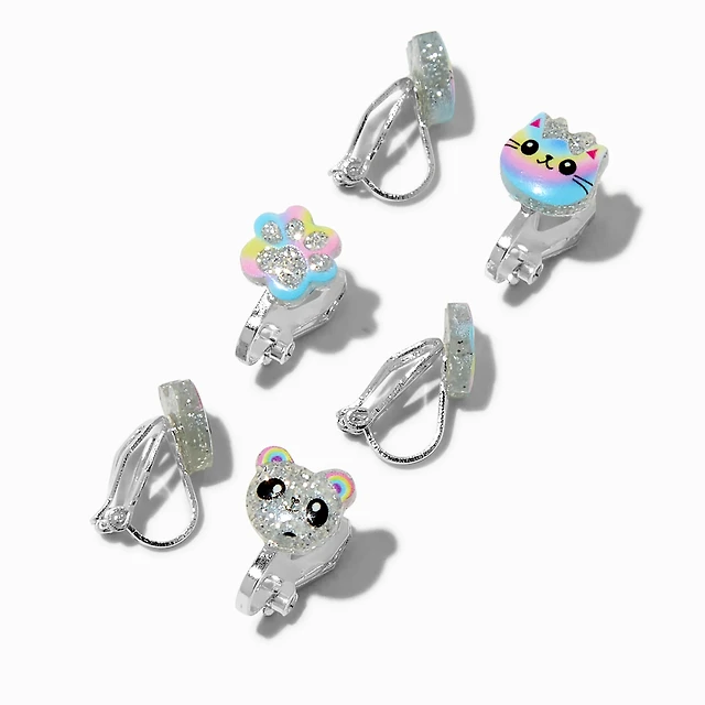 Glitter Cat, Bears & Paws Clip-On Earrings - 3 Pack