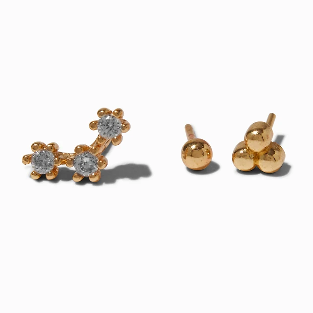 Waterproof Gold Plated Stainless Steel Cubic Zirconia Celestial Stud Earrings 3-Pack