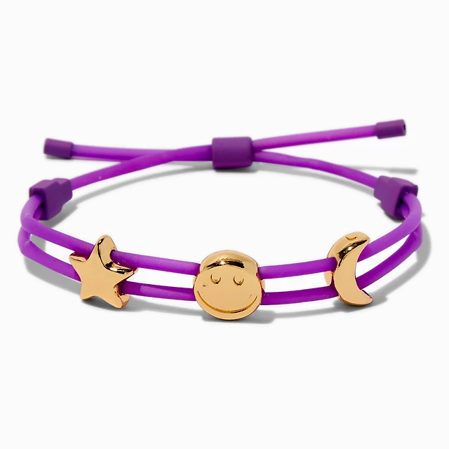 Gold-tone Star, Happy Face & Moon Charm Purple Bolo Bracelet