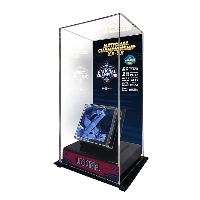 Grande vitrine de présentation des Huskies de l'UConn, champions nationaux de basketball féminin de la NCAA 2025, avec confettis utilisés lors du match