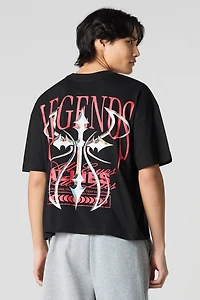 This top features graphic front & back, crew neckline, short sleeves, and boxy fit.