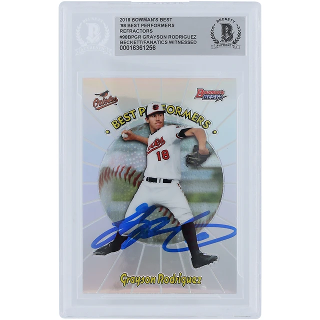Grayson Rodriguez Baltimore Orioles a autographié la carte authentifiée des 98 meilleurs interprètes de Bowman 2018, réfracteurs #98BP-GR Beckett Fanatics