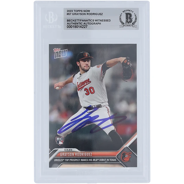 Grayson Rodriguez Baltimore Orioles a autographié la carte Topps 2023 de Beckett pour ses débuts en MLB #57. Les fanatiques ont vu la carte de recrue authentifiée.