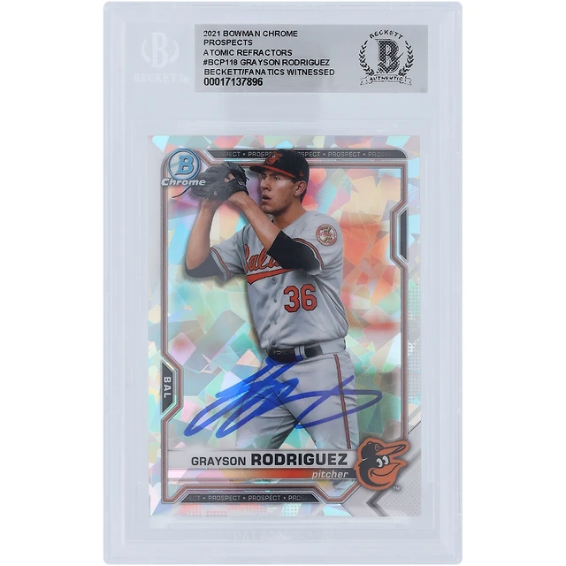 Grayson Rodriguez Baltimore Orioles Autographed 2021 Bowman Chrome Prospects Atomic Refractor #BCP-118 Beckett Fanatics Witnessed Authenticated Card