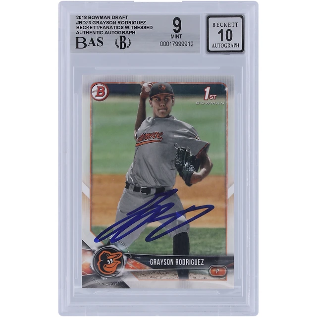 Grayson Rodriguez Baltimore Orioles autographié 2018 Bowman Draft #BD-73 Beckett Fanatics Witnessed Authenticated 9/10 Card