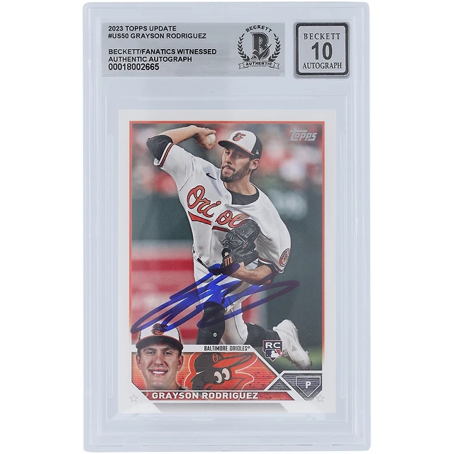Grayson Rodriguez Baltimore Orioles Autographié 2023 Topps Mise à jour #US50 Beckett Fanatics Témoin Authentifié 10 Carte Rookie