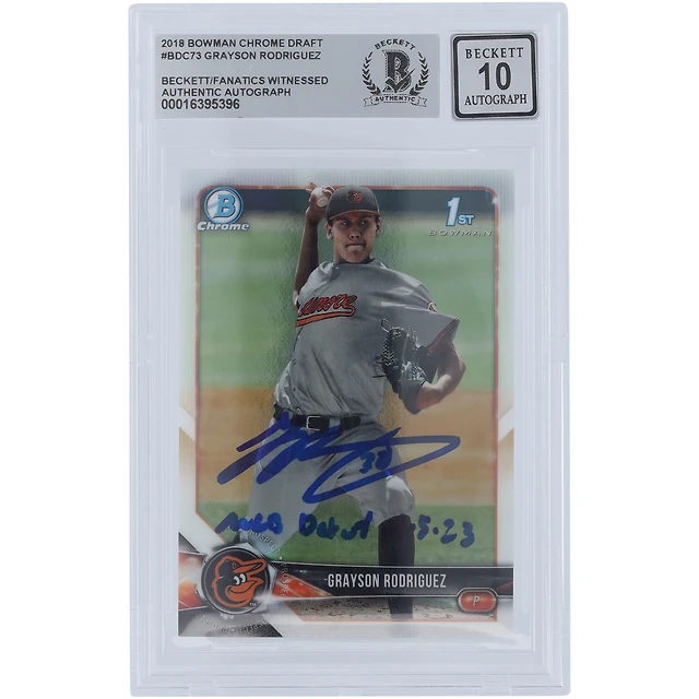 Grayson Rodriguez Baltimore Orioles Carte Bowman Draft Chrome #BDC-73 Beckett Fanatics a été témoin d'une carte 10 authentifiée dédicacée 2018 avec l'inscription "MLB Debut 4-5-23"
