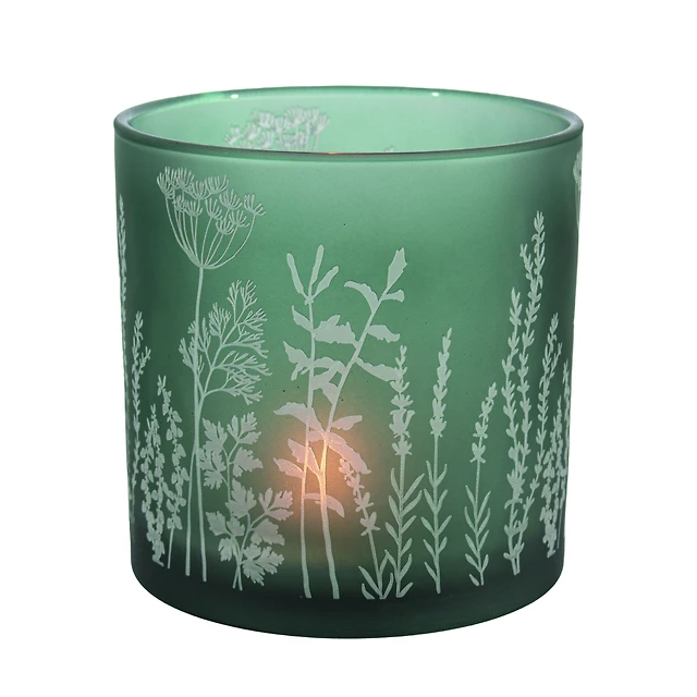 Green Frosted Glass Candle Holder with Wildflowers Decal