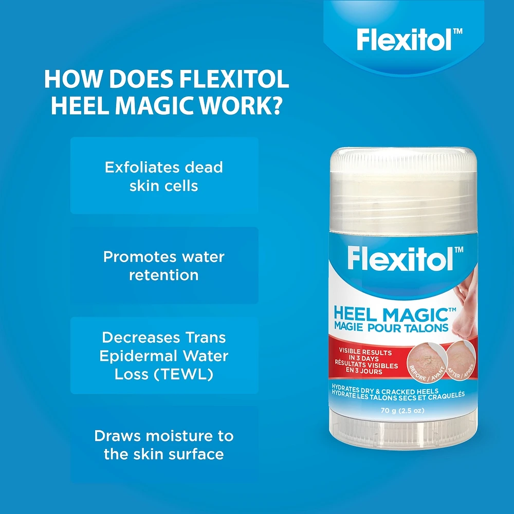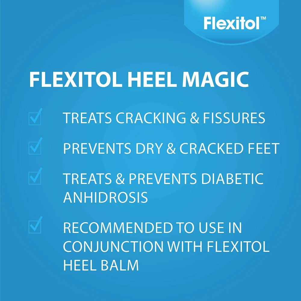 - Visible results in 3 days. Hydrates dry & cracked heels. No mess, convenient, easy to use stick applicator. Unique formulation contains Shea Butter, Olive Oil and 9% Urea. Ideal for those with limited dexterity and movement. Diabetic friendly. Clinically tested. Ideal maintenance product to use in conjunction with Flexitol Heel Balm. Treat cracking and fissures. Prevents dry and cracked feet. Treatement and prevention for Diabetic Foot.