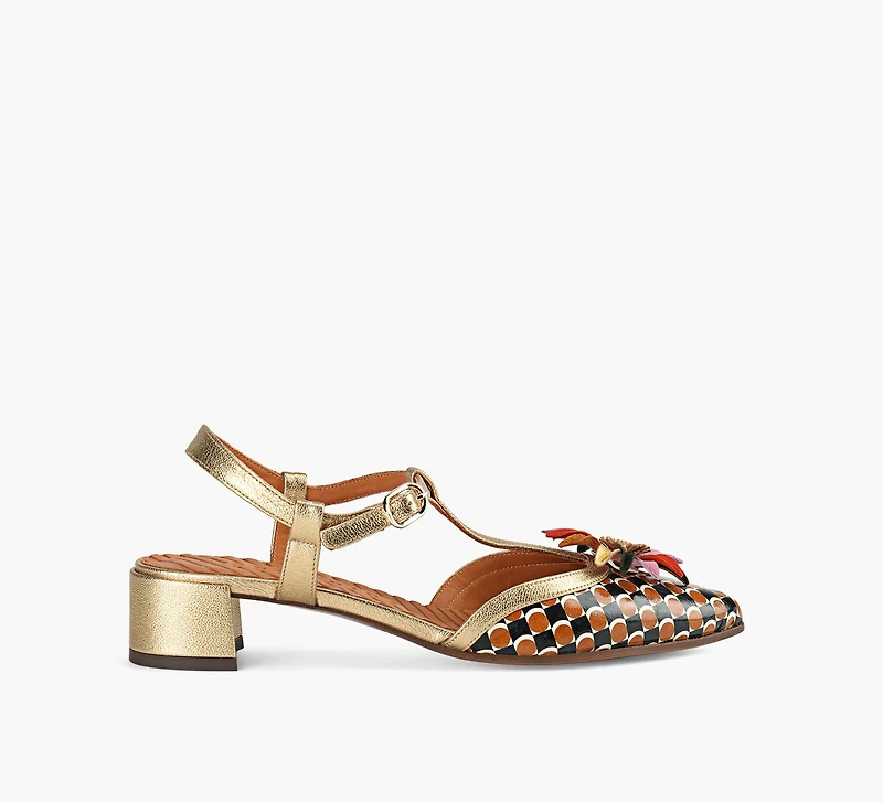 The Chie Mihara Heleni pump blends romantic detailing with sculptural balance. Crafted in smooth calf leather, this pointed‑toe style features a T‑bar strap accented with floral embellishment and secured by a buckle closure. A stable block heel adds comfort and poise, while leather lining and sole ensure a refined finish for elevated day‑to‑evening wear.