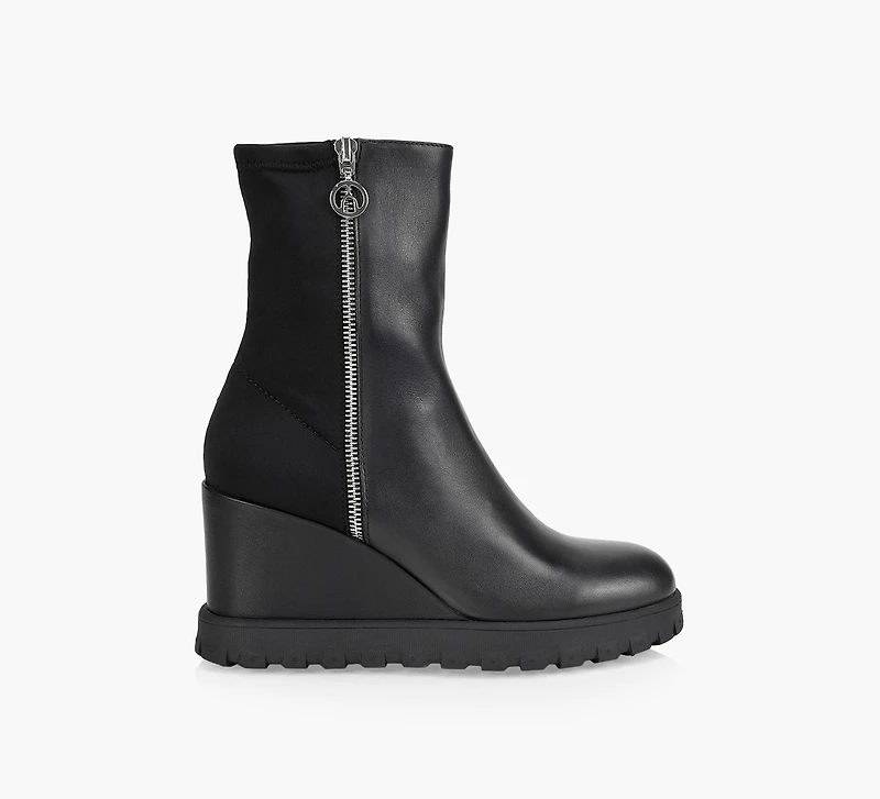 Sleek, svelte, and showy, Ingrid is WISHBONE’s next step into fashion-forward heel boots, presented in a form-fitting silhouette. Featuring Wishbone’s iconic right-angle wedge which adds some skew to a flat under-sole, a side-long zipper emphasizes contrasting tones between the back and front of the upper for a look that is perfectly balanced and chic. Finished with signature WISHBONE hardware.