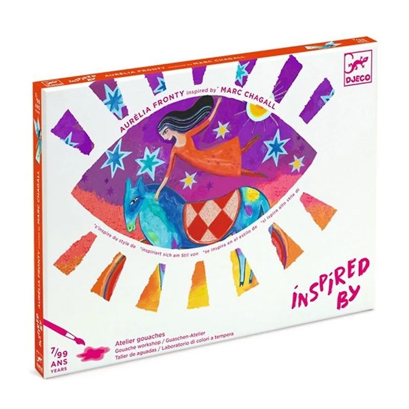 A painting activity with illustrations inspired by the style of the great surrealist master, Marc Chagall. Children add colours in dabs and layer them to reveal these characters floating in mid-air.Ages 7 and up. Aurélia Fronty inspired by Chagall.Contains : 4 illustrations  8 paintings 1 brush