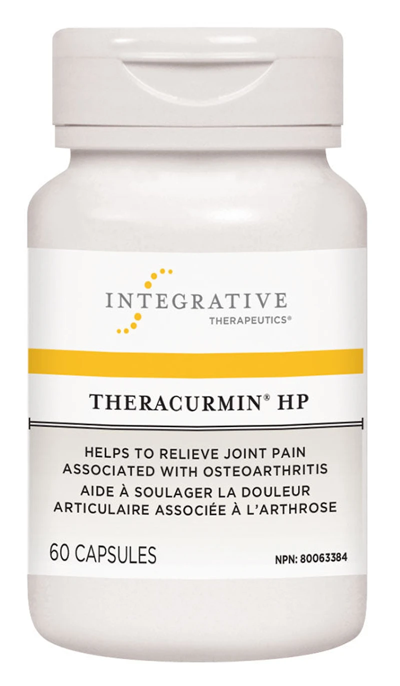 Curcumin helps relieve joint pain associated with osteoarthritisSupports optimal immune functionSupports healthy cardiovascular, liver, lung, and kidney functionTheracurmin HP is proven 27 times more absorbable than standard curcumin supplementsRelief of occasional pain due to overuseDescriptionINTEGRATIVE THERAPEUTICS - Theracurmin HP - 60 Veggie Capsules - NPN: 80063384 -- Curcumin helps relieve joint pain associated with osteoarthritis. Integrative Therapeutics Theracuramin HP is a high absorption Turmeric that utilizes patented, natural colloidal dispersion technology to enhance bioavailability and dramatically increase curcumin level in the blood. It is 27 times more bioavailable compared to ordinary curcumin powder.)INGREDIENTS