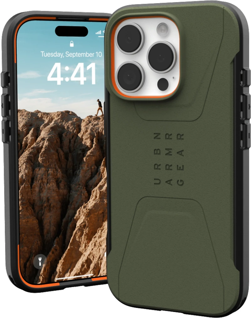 Built with triple-shot overmold construction and a hex cushioning core, the UAG Civilian case series with MagSafe provides 20 ft (6 metres) of drop protection, ensuring your phone stays safe from drops and daily wear. The raised edge shields your screen from scratches and impacts, while the anti-slip grip keeps your device secure in hand. Enjoy the crisp, responsive feel of oversized tactile buttons for easy control on the go.