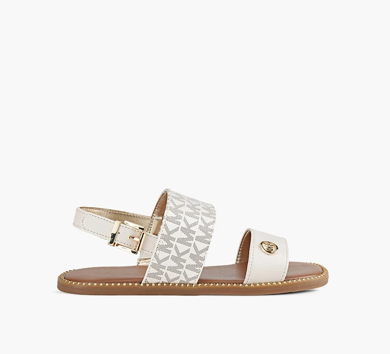 These lovely two strap sandals by Michael Kors are all about chic on-the-go, in a small format for the young fashion maven. Its comfy straps are mounted on a slight heel for a bit of spring to your step, while a hook-and-strap at the heel keeps these lookers secure all day long.