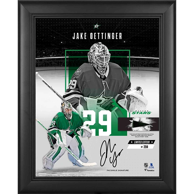 Jake Oettinger Dallas Stars Fac-similé Signature Collage Encadré 11" x 14" Impact avec un morceau de rondelle utilisée en match - Édition limitée à 250