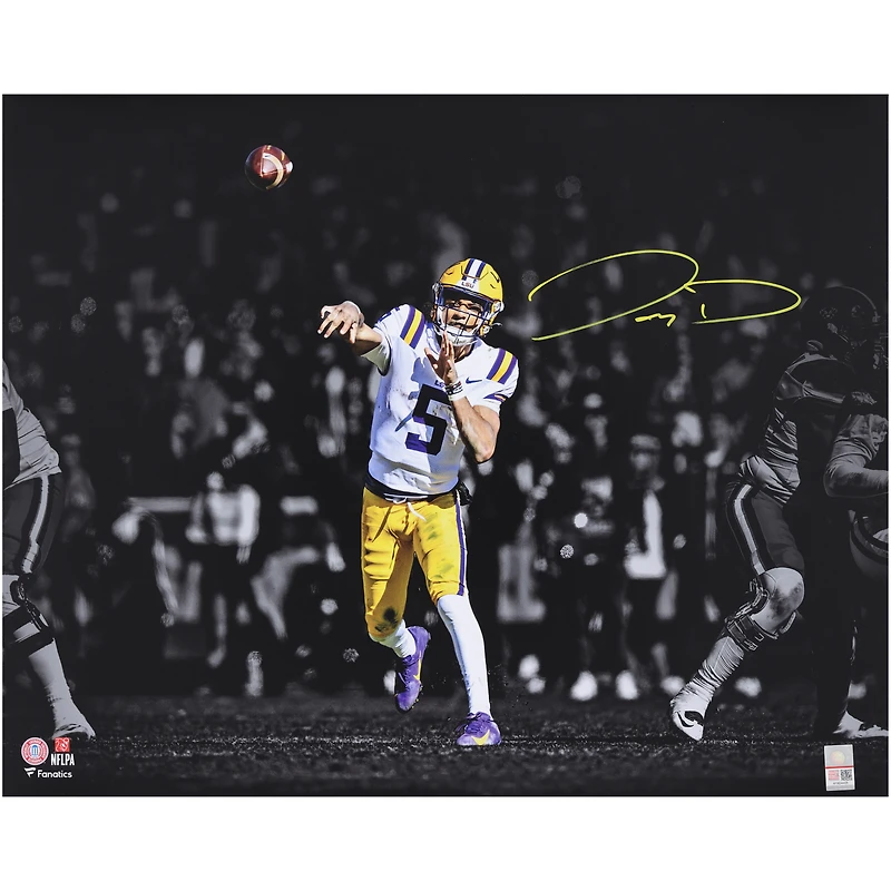 Elevate your collection of LSU Tigers memorabilia with this Jayden Daniels autographed 16" x 20" Throwing Spotlight Photograph. It features an eye-catching image of the 2023 Heisman Trophy winner and his distinct signature. Additionally, this collectible photo includes an individually numbered, tamper-evident hologram that can be verified online to certify authenticity.